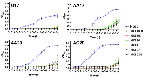 The kill curves for the four tested phages against the corresponding bacterial hosts were performed as previously described [29,40,41] with minor modifications. Briefly, 100 µL aliquots of bacterial subcultures, corresponding to ~107 CFU/mL, were mixed with 100 µL of different dilutions of the tested phages to achieve variable MOIs in a 96-well plate. The plate was incubated in a LogPhase 600 spectrophotometer (Agilent, Santa Clara, CA, USA) at 37 °C with 800 rpm orbital shaking, and the OD600 was measured hourly for 20 h. Experiments were performed on three biological replicates and spotted in three technical replicates. The virulence index was calculated during exponential growth, with the data cut-off at the start of the stationary phase, which lies between 13 and 16 h, depending on the control bacterial host of the respective phage tested. Local virulence (VL) was calculated by dividing the area under the curve (AUC) for each of the tested MOIs by the AUC of the control bacterial host. Then, the obtained value was subtracted from 1 to determine the VL for each MOI. The global virulence index (Vi) was calculated by averaging the AUC obtained from plotting the AUC of each MOI VL against log10 MOI.