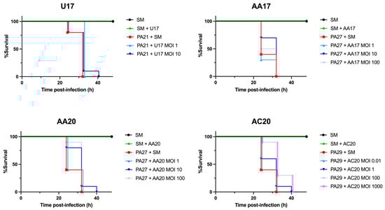 Galleria mellonella infections were conducted as previously described, with several changes [42]. Overnight cultures were set up in LLB using a population of 3–4 bacterial colonies. Cells were subcultured 1:50 and grown to an OD600 of 0.3–0.5, washed once with SM buffer, and then resuspended in SM. Cells and phages were further diluted in SM to reach the desired CFU or PFU/mL. G. mellonella larvae were cultured at 30 °C with a diet composed of the following ratios: 264 g of wheat germ, 132 g of brewer’s yeast, 210 g of beeswax, 132 g of glycerol, 132 g of honey, and 66 g of water. Larvae weighing between 225 and 275 mg were selected for injections. Then, 5 µL of the diluted bacterial suspension was injected into the right proleg of the worm with a 250 µL Hamilton syringe, followed by an injection of the corresponding phage sample into the left proleg an hour after the bacterial administration. SM buffer was selected as the negative control for infections. Larvae were placed in a static 37 °C incubator following the injections, and the survival of the larvae was monitored every 8 h after the 16 h period for a total of 48 h. Larvae were recorded as “dead” if no response to touch was observed. The statistical analysis was performed using the Gehan–Breslow–Wilcoxon test.