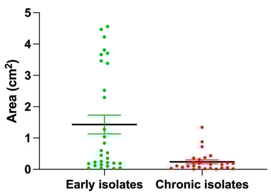 P. aeruginosa isolates are known for their twitching motility, which requires the presence of a functional T4P [74]. However, as a CF infection transitions from early to chronic stages, an adaptive behavior is adopted by P. aeruginosa isolates to adjust to the pulmonary environment of the CF patient. One noticeable adaptation is the loss of flagella- or pilus-mediated motility [75,76,77]. Interestingly, the early isolates in the tested P. aeruginosa panel show a significantly higher twitching motility, which also correlates to their higher scores in the spot test and PHIDA results. Since T4P is a common receptor for diverse P. aeruginosa phages [78] and is more highly expressed in early isolates, these isolates may be more susceptible to phages that use T4P as their receptor. Therefore, we attempt to speculate that phage therapy for patients with CF is likely to be more effective if given in the early stage of the disease. In addition, the use of natural or engineered phages targeting other P. aeruginosa receptors should be considered in the treatment of late-stage CF patients.