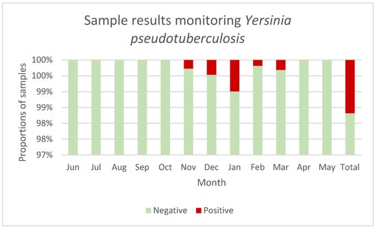 Evaluations of all data available for this study regarding the seasonal occurrence revealed that Y. pseudotuberculosis infections occurred significantly more frequently from November to March than in the other months of the year (p = 0.002) (Figure 1).