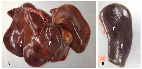 Liver (A) and spleen (B) of a patas monkey (Erythrocebus patas) infected with Y. pseudotuberculosis with multifocal miliary lesions (two lesions of each organ are marked with white arrows). Y. pseudotuberculosis was isolated from both organs by bacteriological examination. Photos (A,B): Martin Peters, CVUA Westphalia.