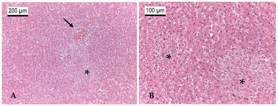 Histo-pathological sections of the liver of a patas monkey (s. Figure 2) with mild periportal lymphocytic infiltrates (black arrow) (A) and acute irregular necrotic to pyogranulomatous lesions (black stars) (A,B) as depicted in the higher magnification (B). H&E staining; 100× magnification (A), 200× magnification (B). Photos (A,B): Martin Peters, CVUA Westphalia.
