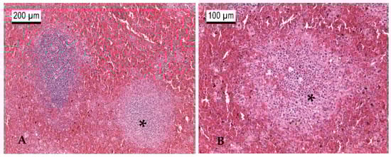 Histo-pathological sections of the spleen of a patas monkey (s. Figure 2). Severe congestion and multifocal acute coagulation necrosis (black star) (A) and pyogranulomatous foci depicted in the higher magnification (B). H&E staining at 100× magnification (A) and 200× magnification (B). Photos (A,B): Martin Peters, CVUA Westphalia.