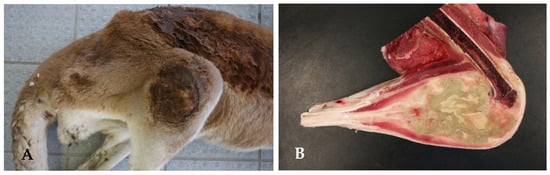 In February 2020, a male brown spider monkey (Ateles hybridus) in the Neuwied Zoo was apathetic and had a fever (39.6 °C) and respiratory signs (Table 3, P10). The spider monkey was taken to a veterinary clinic and received an antimicrobial treatment with amoxicillin/clavulanic acid (Synulox 50 mg [40 mg amoxicillin/10 mg clavulanic acid], Zoetis Germany GmbH, Berlin, Germany) and the non-steroidal anti-inflammatory drug (NSAID) meloxicam (Metacam 0.5 mg/mL, Boehringer Ingelheim Vetmedica GmbH, Rosenheim, Germany). The animal died the next morning, and the pathological examination revealed multifocal necrotizing hepatitis and splenitis, necrotizing myelitis with bacterial foci visible in patho-histology, and diffuse catarrhal enteritis.