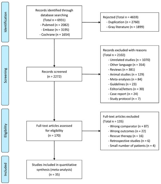 A flowchart explaining the study selection process is shown in Figure 1. A total of 6931 articles were identified from the three databases, of which 2760 duplicate articles and 1899 gray literature articles were excluded after screening the titles and abstracts. Additionally, 2102 other articles were excluded based on the exclusion criteria. Finally, the full texts of 170 articles were reviewed. Of these, 135 articles were excluded because of incorrect comparators, incorrect outcomes, rescue H. pylori therapy, the retrospective design, and small numbers of enrolled patients. Finally, 35 RCTs were considered suitable for inclusion in this systematic review and meta-analysis [22,23,24,25,26,27,28,29,30,31,32,33,34,35,36,37,38,39,40,41,42,43,44,45,46,47,48,49,50,51,52,53,54,55,56]. The detailed characteristics of the included studies are presented in Table 1.