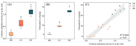 The carbonic anhydrase activity, chlorophyll-a content and their correlation. (A) Carbonic anhydrase activities of the three sample types. (B) Chlorophyll-a content in the three sample types. (C) Correlation between carbonic anhydrase activity and chlorophyll-a content (y = 24.0379x − 3.8156, R2 = 0.8866, p < 0.05). The presence of distinct letters (a, b, and c) indicates noteworthy variances between groups, with a significance level below p < 0.05. The scattered solid shapes depict the specimens obtained from various sites, with yellow, red and blue scatters symbolizing samples collected from bare soil (BS), light biocrusts (LCs) and dark biocrusts (DCs), respectively.