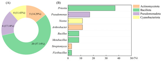 The composition of carbonatogenic bacteria. (A) Classification of strains at phylum level. (B) Classification of strains at genus level.
