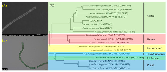 Morphological and phylogenetic tree analyses of strain SCSIO19859. (A) Scanning electron microscopy analysis of SCSIO19859. (B) Optical microscope analysis of SCSIO19859. (C) Phylogenetic tree analysis of SCSIO19859.