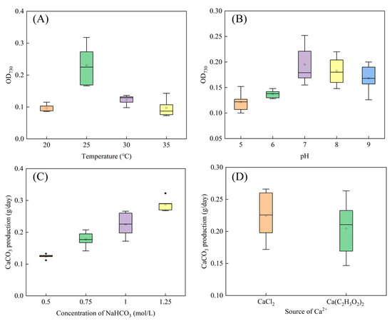 Optimization of carbonate formation conditions of SCSIO19859. (A) The optimal temperature for SCSIO19859 growth. (B) The optimal pH for SCSIO19859 growth. (C) The optimal NaHCO3 concentration for CaCO3 production. (D) The optimal Ca2+ source for CaCO3 production.