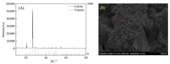 XRD and SEM analyses of calcium carbonate in sand consolidation for treatment with strain SCSIO19859. (A) XRD analysis of CaCO3 crystals during sand consolidation. The horizontal coordinate in the XRD analysis is twice the incidence angle of the X-ray (2θ), and the vertical coordinate indicates the diffraction intensity. (B) SEM analysis of CaCO3 crystal during sand consolidation at 300× magnification. The red arrow indicates the presence of calcium carbonate crystals on the surface and within the interstices of sand particles.