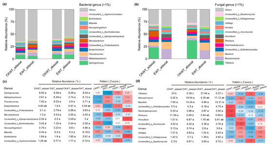 3.3. E. turcicum Changed the Bacterial and Fungal Genera on the Adaxial and Abaxial Surfaces of Both CKWT and EWT Maize Leaves