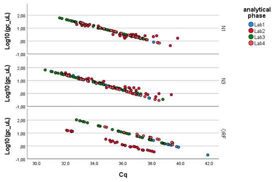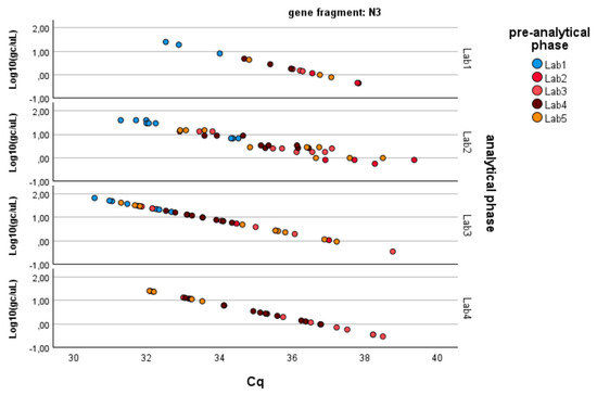 Log-transformed detections of N3 gene fragment copies/µL concentration: differences among laboratories concerning the analytical and pre-analytical phases. Full regression statistics for the linear relationship depicted in the chart are provided in Table S3.