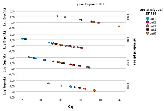 Log-transformed detections of ORF1ab gene fragment copies/µL concentration: differences among laboratories concerning the analytical and pre-analytical phases. Full regression statistics for the linear relationship depicted in the chart are provided in Table S4.