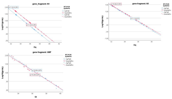 Linear relationships of the log-transformed gene copy values and Cq for the three gene fragments (N1, N3, and ORFab) of the two different RT-PCR systems (e.g., AgPath and QuantaBio).