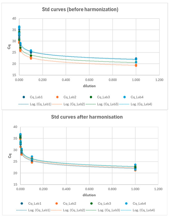 After identifying the primary issue in the analytical phase for the ORF gene, an effort was made to reverify the standardization of protocols, and the reference standards for the ORF gene were redistributed to ensure that all laboratories had the opportunity to reconstruct their standard curves accordingly. The standard curves from the three laboratories were compared at two key points: (1) before the harmonization and (2) after the harmonization process (Figure 8). A Generalized Linear Model (GLM) approach (cfr. Equation (4)) was employed to compare the relationship between log-transformed Cq values and log-transformed dilutions across the laboratories. The results presented in Table 6 indicate that, following harmonization, all the standard curves were comparable across the laboratories (e.g., Lab*log_dilution interaction not significant; see also Figure S1).