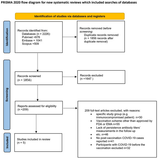 The methodology for this systematic review began with a thorough search of electronic databases including Embase and MEDLINE/PubMed, conducted on 4 January 2023. The search strategy was structured to include relevant terms related to COVID-19 or SARS-CoV-2, antibody levels or immunogenicity, and vaccines or vaccination. The full search query can be found in the Supplementary Materials (Table 1).