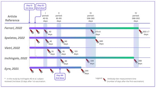 Timeline depicting serum sample collections in the included studies. Ferrari D et al. (2022) [17]; Speletas M et al. (2022) [18]; Vietri MT et al. (2022) [19]; Inchingolo AD et al. (2022) [20]; Eyre DW et al. (2021) [21].