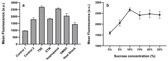 After 72 h of cultivation, the cell cultures were harvested following the modified method of Lee [33]. The cells were resuspended in one of the following solutions: 1 mL 70% (w/v) isopropanol, 1 mL 1% (w/v) dimethyl sulfoxide (DMSO, Sinopharm chemical Reagent Co., Ltd., Shanghai, China), 1 mL ice-cold TSE buffer (10% (w/v) sucrose (Aladdin, Shanghai, China), 10 mM Tris-HCl (pH7.5) (Sigma-Aldrich, St. Louis, MO, USA), 0.5 mM EDTA (Sangon Biotech, Shanghai, China), or 1 mL ice-cold ETM buffer (0.5 M sorbitol, 0.5 M mannitol (Aladdin), 10% glycerol (Aladdin)). Each mixture was then incubated on ice for 10 min.