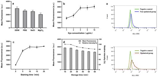 The fluorescence staining procedure was optimized to achieve increased and more consistent FI. To enhance the binding of fluorescent molecules to the target, we first investigated the effects of commonly used staining buffers—DDW, PBS, 0.9% NaCl, and 1 mM MgCl2—on B. subtilis cells. As shown in Figure 3a, cells suspended in DDW demonstrated the most effective staining.