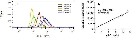 To verify the correlation between MK-7 content and FI, the cells cultured with five distinct protocols were stained under the optimized conditions, and the MK-7 yield was assayed. The correlation between the mean MK-7 yields and the average FI values was calculated.