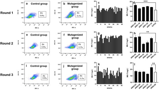 In each mutagenesis cycle, the mutant that produced the highest yield of MK-7 was designated as the starting strain (control group) for the next round of mutagenesis. Three cycles of mutagenesis and high-throughput sorting were performed, as shown in Figure 5. Observation of the rounds in Figure 5a,b reveals a notable rightward shift in the cell population following ARTP mutagenesis, indicating an increased presence of positively fluorescing cells within the mutagenized group. This suggests a potential abundance of positive mutant strains.