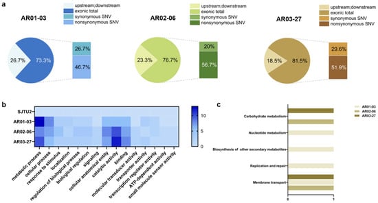 Annotation and functional cluster analysis were then performed for each SNP mutant gene. The GO functional cluster analysis (shown in Figure 6b) revealed that the SNPs in AR01-03 were predominantly clustered in the “metabolic processes” category. These mutations mainly included genes associated with cell repair or genetic metabolism, such as endonuclease/exonuclease and deoxyribonuclease. Conversely, the mutations observed in AR02-06 and AR03-27 were mainly concentrated in the “catalytic activity” category, predominantly affecting molecular functions related to signal transduction or transporter proteins. Noteworthy examples include the two-component system sensor histidine kinase, the major facilitator superfamily (MFS) transporter, the ATP-binding cassette transporter (ABC transporter), penetrase, and so on. Furthermore, while only a few genes match data in the KEGG database (as depicted in Figure 6c), it is notable that all three high-yielding mutants had mutated genes associated with membrane transport. AR01-03, AR02-06, and AR03-27 have 4, 2, and 2 genes annotated, respectively. For example, GC000777 in AR02-06 and AR03-27 encodes an extracellular solute-binding protein. In AR01-03, GC001710, GC003062, and GC004100 encode aspartyl-phosphate phosphatase YisI, an MFS transporter, and an ABC transporter permease subunit, respectively.