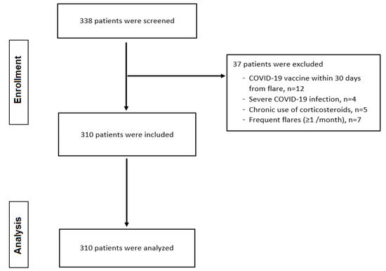 Overall, 338 HS patients were assessed for their eligibility to be included in the study. Among them, 12 with HS flare following COVID-19 disease were excluded because they had received a COVID-19 vaccine within 30 days prior to the onset of the flare; therefore, the flare could be associated to the vaccination and not to COVID-19 disease [24]. Moreover, four patients were excluded because they suffered critical or severe COVID-19 illness, seven patients with frequent flares (≥1 flare/month), and five patients who were receiving corticosteroids on a chronic basis for other autoimmune diseases such as rheumatoid arthritis. Finally, 310 HS patients who had COVID-19 disease were included (Figure 1). In all these patients, COVID-19 disease was confirmed by a positive rapid test and/or PCR.