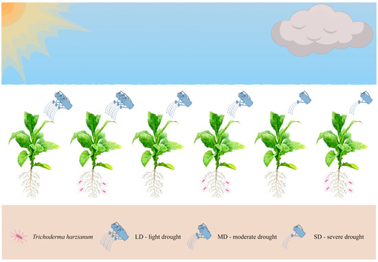 The study was conducted using Nicotiana tabacum cultivar K362, and seeds provided by the College of Tobacco Science at Henan Agricultural University. Seedlings were germinated from seeds in controlled conditions and subsequently transplanted. To systematically study the mechanisms, a total of 180 well-grown plants at the same growth stage were selected for drought and T. harzianum treatments. Plants were divided into 6 groups, with 30 plants in each group, as follows: light drought (LD), light drought with T. harzianum (LDTh), moderate drought (MD), moderate drought with T. harzianum (MDTh), severe drought (SD), and severe drought with T. harzianum (SDTh) (Figure 1). Soil moisture levels were maintained as follows: CK (control): 70% of field capacity; LD (light drought): 60% of field capacity; MD (moderate drought): 50% of field capacity; SD (severe drought): 40% of field capacity. Soil moisture levels were monitored periodically to ensure consistency.