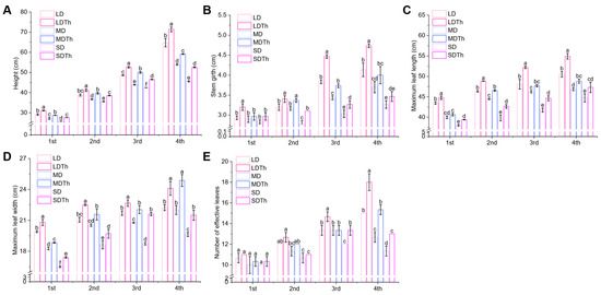Enhancement of N. tabacum L.’s agronomic traits after T. harzianum inoculation under light drought (LD), moderate drought (MD), and severe drought (SD). (A) Height; (B) stem grith; (C) maximum leaf width; (D) maximum leaf length; (E) number of effective leaves.