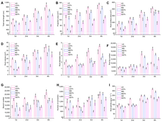 Roots, as essential organs for water and nutrient absorption, play a crucial role in providing plants with the necessary substances for growth. Observation of the root systems revealed that the roots of plants inoculated with T. harzianum were generally better developed than those of the non-inoculated plants (Figure S2). An assessment of root system parameters showed that T. harzianum inoculation under drought stress significantly affected total root length (Figure 4A), projection area (Figure 4B), root surface area (Figure 4C), root volume (Figure 4D), root diameter (Figure 4E), root tip number (Figure 4F), branch number (Figure 4G), root connectivity (Figure 4H), and root activity (Figure 4I). Compared to the corresponding drought-only treatments (LD, MD, and SD), all indicators in the T. harzianum-inoculated treatments (LDTh, MDTh, and SDTh) were consistently higher. Specifically, total root length increased by 17.90%, 29.87%, and 47.68%; root projection area by 39.86%, 62.97%, and 32.41%; root surface area by 19.68%, 24.40%, and 41.19%; root volume by 101.36%, 166.89%, and 55.22%; root diameter by 28.30%, 21.38%, and 30.46%; root tip number by 73.58%, 61.72%, and 60.67%; branch number by 30.07%, 24.32%, 39.66%; root connectivity by 30.43%, 36.10%, and 30.72%; root activity by 36.69%, 33.63%, 16.75%.