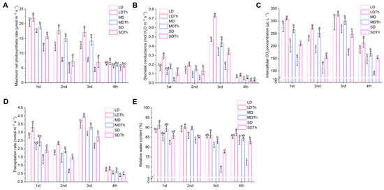 Photosynthesis is one of the most critical chemical reactions on Earth and is among the physiological processes in green plants most sensitive to drought. Measurements of photosynthetic parameters showed that inoculation with T. harzianum under drought stress significantly enhanced net photosynthetic rate (Figure 5A), stomatal conductance (Figure 5B), transpiration rate (Figure 5C), intercellular CO2 concentration (Figure 5D), and leaf relative water content (Figure 5E). In all cases, the indicators in the Trichoderma-treated groups (LDTh, MDTh, and SDTh) were higher than those in the corresponding drought-only groups (LD, MD, and SD). Specifically, the net photosynthetic rate increased by 48.89%, 101.56%, and 52.75%; stomatal conductance by 82.03%, 43.72%, and 288.78%; intercellular CO2 concentration by 20.01%, 36.79%, and 43.12%; transpiration rate by 34.29%, 33.93%, and 152.71%; and leaf relative water content by 3.60%, 5.43%, and 4.74%.