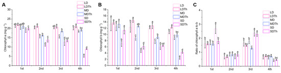 After measuring photosynthetic parameters, the associated pigments were also assessed. Inoculation with T. harzianum (LDTh, MDTh, and SDTh) resulted in higher levels of both chlorophyll a (Figure 6A) and chlorophyll b (Figure 6B) compared to the corresponding drought treatments (LD, MD, and SD). Chlorophyll a content increased by 5.79%, 5.00%, and 81.73%, while chlorophyll b content increased by 17.23%, 44.64%, and 32.30%. The chlorophyll a to b ratio ranged from 0.5 to 2.5 and was significantly higher under severe drought (SD) conditions during the first and third sampling periods (Figure 6C).