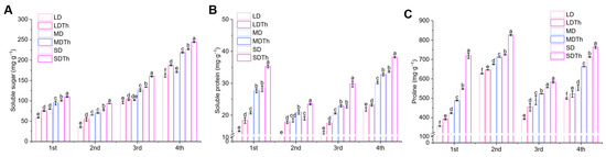 Plants often respond to abiotic stress by altering the levels of osmotic regulators. Therefore, we measured the contents of soluble sugar (Figure 7A), soluble protein (Figure 7B), and proline (Figure 7C). Inoculation with T. harzianum (LDTh, MDTh, and SDTh) resulted in higher levels of these substances compared to the corresponding drought treatments (LD, MD, and SD). Specifically, soluble sugar content increased by 51.38%, 7.80%, and 19.62%; soluble protein content increased by 22.39%, 33.11%, and 24.81%; and proline content increased by 10.01%, 15.28%, and 31.00%.