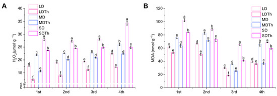 The membrane lipid peroxidation index, mainly H2O2 (hydrogen peroxide) and MDA (malondialdehyde) contents, reflect the oxidative stress experienced by plants. Measurements revealed that H2O2 (Figure 8A) and MDA (Figure 8B) contents in Trichoderma-treated groups (LDTh, MDTh, and SDTh) were lower than those in the corresponding drought-treated groups (LD, MD, and SD). Specifically, H2O2 content decreased by 30.15%, 28.46%, and 15.29%, and MDA content decreased by 38.05%, 28.69%, and 37.00%.