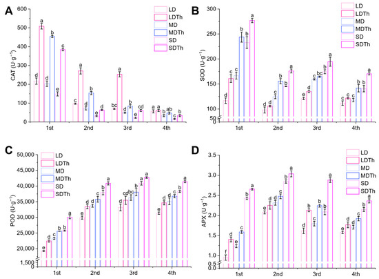 The same part of the leaf was frozen with liquid N and stored at −80 °C. The activities of catalase (CAT), peroxidase (POD), superoxide dismutase (SOD), and ascorbate peroxidase (APX) were measured using the Solarbio reagent kit.
