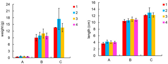 Growth performance of shrimp. A, B, and C represent the pre-, mid-, and late-culture stages, respectively, and 1, 2, 3, and 4 represent the four ponds.