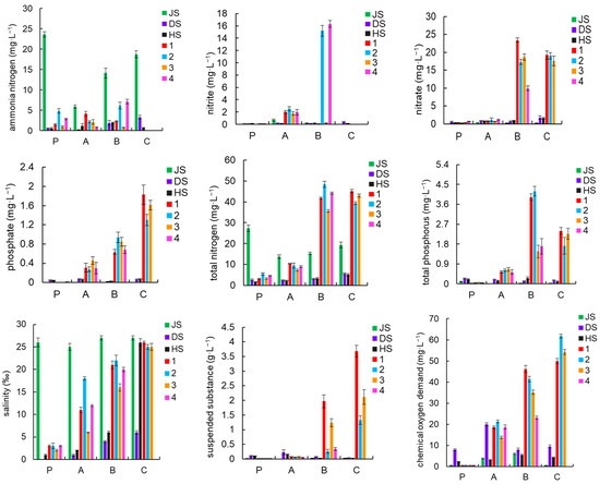 Characteristics of water quality indicator changes. Seawater, groundwater, and river water are represented by HS, JS, and DS, respectively; 1, 2, 3, and 4 represent the four ponds; and P, A, B, and C represent the baseline environment and pre-, mid-, and late-stage samples, respectively.