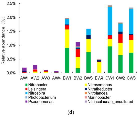 Referring to the research on the types of nitrifying bacteria in shrimp pond culture by Xu et al. [8], the nitrifying bacteria identified in the pond water of this study included Nitrobacter (0.38%), Nitrosomonas (0.29%), Nitrospira (0.24%), Leisingera (0.11%), Pseudomonas (0.05%), Nitratireductor (0.04%), Photobacterium (0.009%), Nitrolancea (0.008%), Marinobacter (0.003%), Nitrincolaceae (0.001%), and Nitrospina (0.001%) (Figure 3d). During the preculture stage, the relative abundances of the dominant nitrifying bacterial genera, from the highest to lowest, were Pseudomonas (0.09%), Leisingera (0.04%), and Nitrosomonas (0.03%). During the mid-culture stage, the dominant nitrifying bacterial genera were Nitrosomonas (0.48%), Nitrobacter (0.46%) and Leisingera (0.11%). During the later culture stages, the dominant nitrifying bacterial genera were Nitrosomonas (0.78%), Nitrobacter (0.39%), and Leisingera (0.21%).