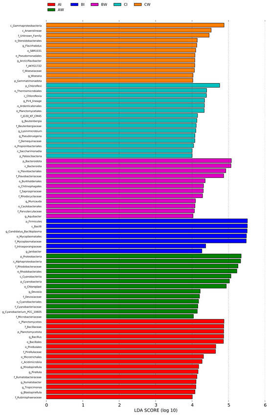 Microbial difference comparison. AW, pond water during the preculture stage; BW, pond water during the mid-culture stage; CW, pond water during the late-culture stage; AI, shrimp intestines during the pre-culture stage; BI, shrimp intestines during the mid-culture stage; CI, shrimp intestines during the late-culture stage.