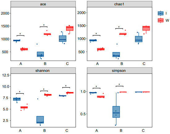 Alpha diversity index analysis. W and I represent pond water and shrimp intestines, and A, B, and C represent pre-, mid-, and late-stage samples, respectively; * represents p < 0.05.