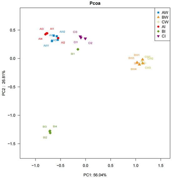 PCoA analysis. AW1, AW2, AW3, and AW4 represent pond water in four ponds during the pre-culture stage; BW1, BW2, BW3, and BW4 represent pond water in four ponds during the mid-culture stage; CW1, CW2, and CW3 represent pond water in three ponds during the late-culture stage; AI1, AI2, AI3, and AI4 represent shrimp intestines in four ponds during the pre-culture stage; BI1, BI2, BI3, and BI4 represent shrimp intestines in four ponds during the mid-culture stage; and CI1, CI2, and CI3 represent shrimp intestines in three ponds during the late-culture stage.