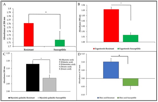 3.1. Comparisons of LPS, Ergosterols, Mysristic, Palmitic, and Oleic Acids of Susceptible and Resistant Strains of S. typhimurium