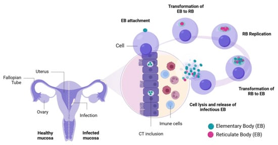 The developmental cycle of Chlamydia trachomatis in the female reproductive tract. Created with BioRender.com accessed on 23 December 2024.