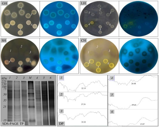 Enzymatic and protein profile of native bacterial consortia. CoP1 cultured in MSM-diesel 1% (1), 5% (2), 10% (3); CoP2 cultured in MSM-diesel 1% (4), 5% (5), 10% (6). Protease (gelatin hydrolysis, GH); lipase (lipid hydrolysis, LH); amylase (starch hydrolysis, SH); cellulase (cellulose hydrolysis, CH); Petri plates observed under visible and UV light. SDS-PAGE of total-cell protein (TP), broad-range protein molecular weight marker, Promega (M); densitometry plots (DP) for the SDS-PAGE gel.