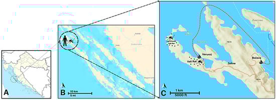 Sampling area on Dugi Otok Island. (A) Geographic location of Dugi Otok Island; (B) Human and mosquito sampling area in the Veli Rat; (C) Dengue-positive German tourist boat movement (presented with a red dashed line). X represents mosquito sampling micro-localities.