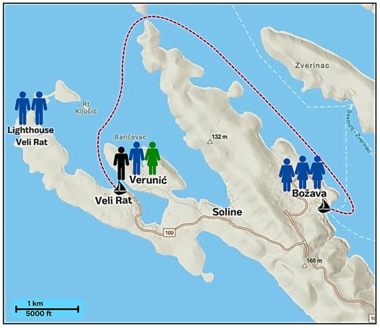 Geographic distribution of dengue seropositive individuals in the villages of Veli Rat surroundings: black silhouette–confirmed case (seroconversion in paired serum samples), blue silhouettes–probable cases (IgM detection in a single serum sample), green silhouette–IgG seropositive (in a single serum sample). A red dashed line represents dengue-positive German tourist boat movement.