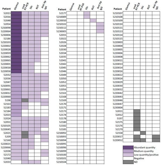 Results for H. pylori detection for each method by patient. All the positive samples for H. pylori are in purple. ND: Not determined.