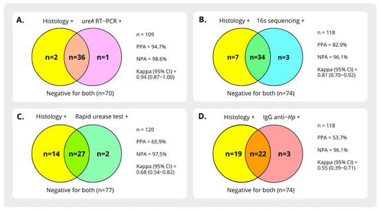 Venn diagram illustrating the positive agreement between histology with Giemsa staining of gastric mucosa samples and other diagnostic methods. (A) Comparison of gastric histology with ureA RNA detection by RT-qPCR in gastric samples. (B) Comparison of gastric histology with H. pylori detection by 16S rRNA amplification and sequence analysis. (C) Comparison of gastric histology with urease activity detection using the Rapid Urease Test (RUT). (D) Comparison of gastric histology with IgG anti-H. pylori detection in serum by ELISA.