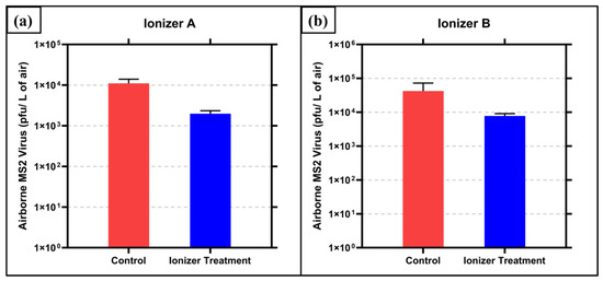 The results of the bacteriophage MS2 inactivation testing with Ionizer A exposure are shown in Figure 2a. The control (no ionizer exposure) air samples contained 1.1 × 104 (±2.46 × 103) pfu/liter of air of bacteriophage MS2. The air samples exposed to ions generated by ionizer A contained 1.98 × 103 (±3 × 102) pfu/liter of air. This translates to an 82.02% (0.745 log10) reduction (p = 0.0032). The temperature and relative humidity were measured to be 21 °C and 56%, respectively.