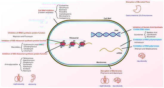 The development of new antibiotics is widely considered a potential solution to the AMR crisis. According to a World Health Organization (WHO) report in 2024, the current clinical antimicrobial pipeline contains 97 antimicrobial agents and/or combinations. However, this is still insufficient to address the growing threat of drug-resistant infections [22]. Although antibiotics were developed for human and animal pathogens, their effect targets (e.g., cell walls, ribosomes, and RNA polymerases) are not unique (Figure 2, Table 1). This allows antibiotics to indiscriminately affect both pathogenic and benign bacteria, thereby disrupting the balance of numerous metabolic transformations. In this review, we discuss how antibiotics acutely and chronically influence the complexity of microbial communities. We also elucidate the relevant factors contributing to clinical scenarios where antimicrobial treatment fails and propose potential strategies to mitigate these challenges (Figure 3).